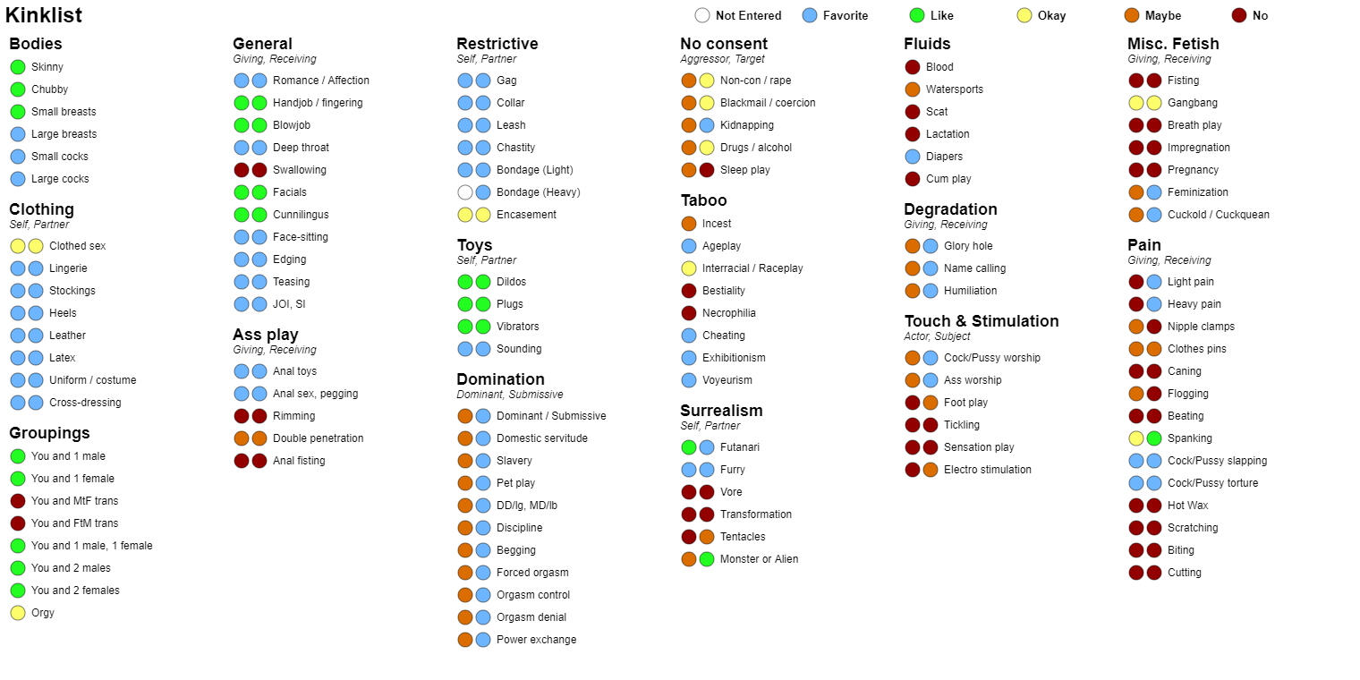 Like other people, I am open for rp/erp. But there are limits to what I can and can't do. Please follow this kink list. My limits are anything that includes body waste and hard gore.